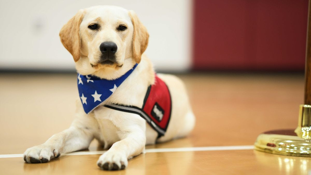The dog introduced at today’s event is named River. He is a Yellow Lab.