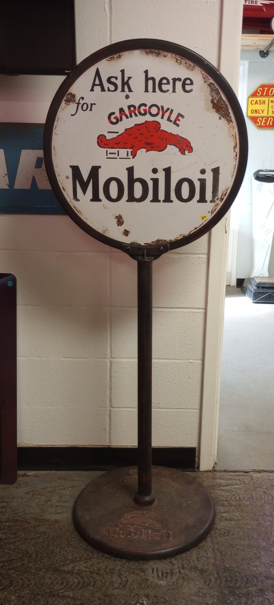 The first photo you see is of the Mobiloil sign that was given to me. The one on the right is one just like it, so you can see how it looks with the stand on it, hence the name “lolliepop sign”. The one that was found in the river in Summers County has some damage, but as you can see, most of the ones that have survived the test of time have some damage. Remington hunted and hunted but could not find the metal base for it.