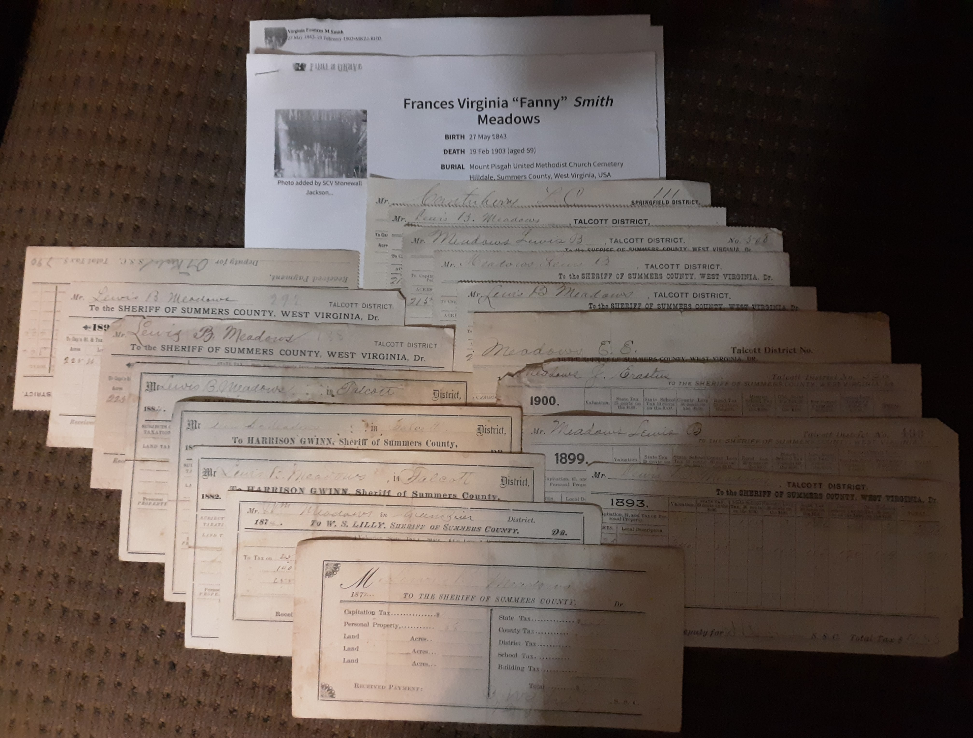 Now, as for the early Summers County tax receipts, you see. About 15 years ago, my great-great-cousin Gene Wallace “Wilkie,” as we all always called him, brought them to me and some other family pieces. He came down from OH to visit my Granddad Thompson, his first cousin, and just happened to bring me these things because he knew how much I loved history.