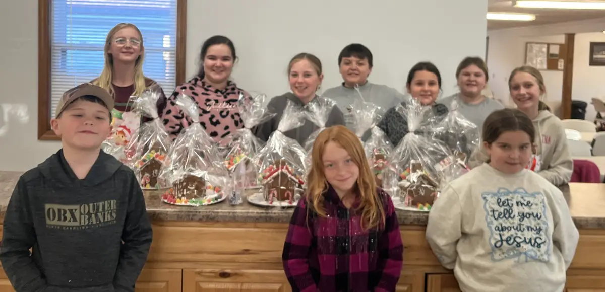 Next came the highlight of the day, building and decorating their gingerbread houses. The picture shows the kids standing around their completed houses. Front row, left to right: Jacob Brogan, Havyn Salmons, and Karsyn Fox; back row: Hailey Matney, Brooke Fox, Sydney Fox, Jayson Little, Maddie Spinelli, Jayden Little, and Brystal Little.