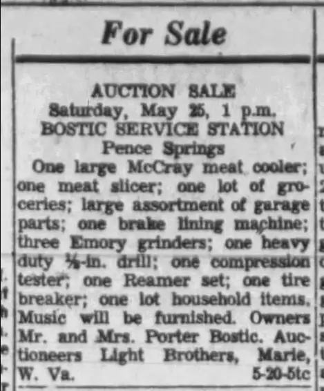 I recently found this auction advertisement for Bostics Service Station in Pence Springs from 1957. I always assumed that Country Roads Store had started out as Keatleys Cash Grocery. But apparently, Mr. and Mrs. Porter Bostic sold it to the Keatleys. This auction advertisement for Bostic Service Station lists this large McCray meat cooler as one of the items in the auction sale.